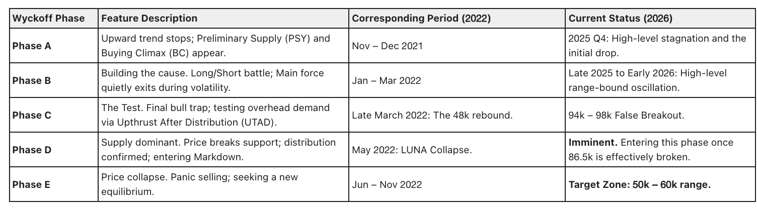 Current BTC price action is not random chart-drawing. It sits inside a highly structured Wyckoff distribution pattern. To understand where we are, we must revisit the 2022 pre-crash structure.