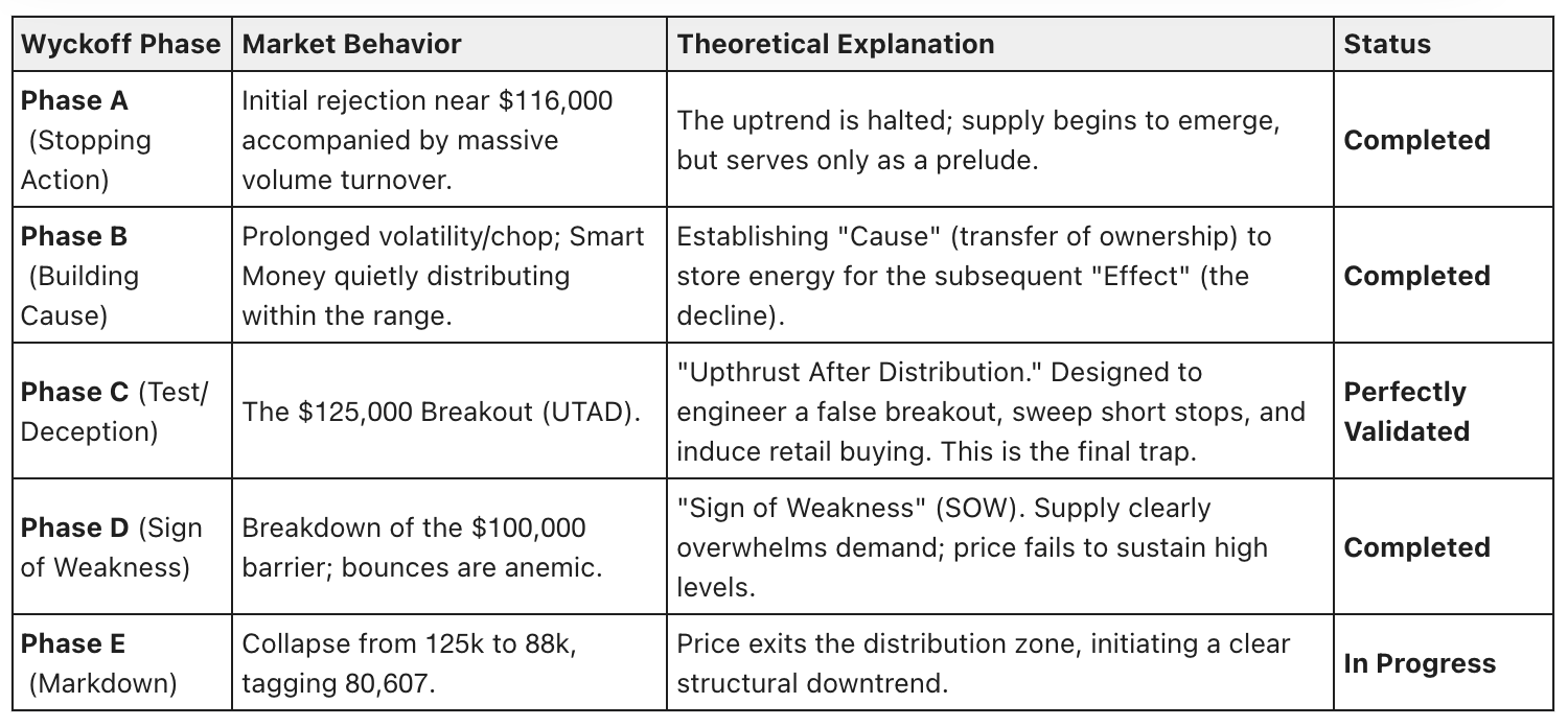 One of our core market structure models—the Wyckoff Methodology—has completed its most critical phase. Let’s benchmark the current price action against the theoretical framework: